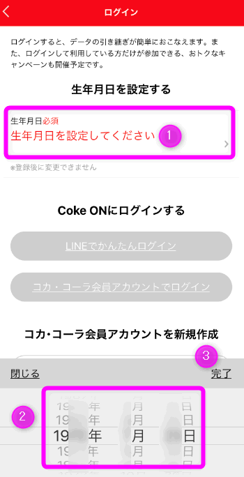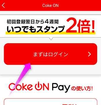 起動するとログインを求められます。まだアカウントを作成していない場合は、「利用規約に同意してCoke ONをはじめる」をタップします。