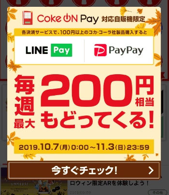まれにキャンペーンを行っていて、Coke ONアプリにLINE PayやPayPayを登録してジュースを購入するとキャッシュバックされます。100円のジュースを購入すると100円がキャッシュバック??と思ったのですが