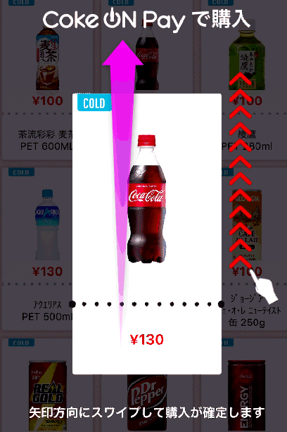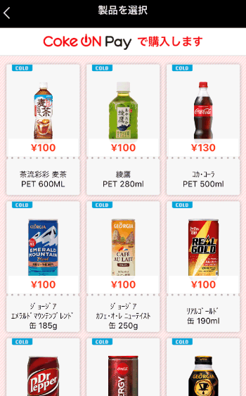 自動販売機で購入できる飲料が表示されるので、購入したい製品をタップします。今回はコカ・コーラを選択しました。
