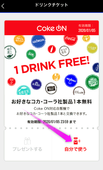 スタンプを15個集めると、無料で好きなジュースを購入できるようになります。購入方法はCoke ON Payと全く同じ。