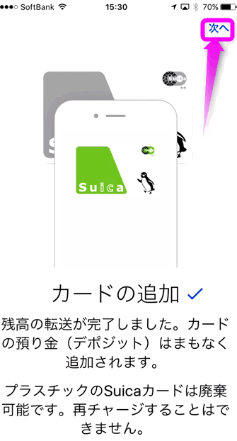 「カードの追加」と表示されれば完了です。右上の「次へ」をタップします。