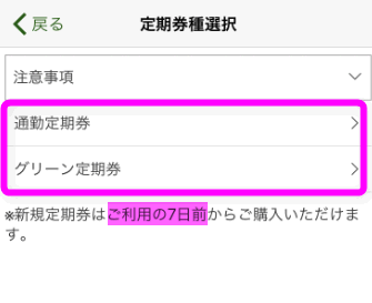 「定期券種選択」の画面で「グリーン定期券」をタップ。