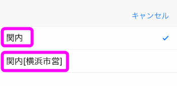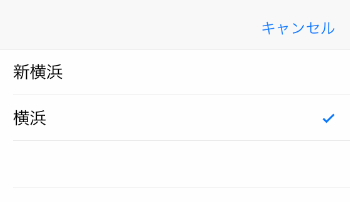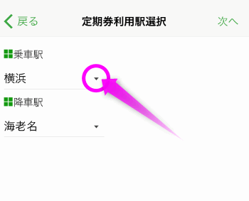 ヒットした駅名が表示されるので、右横にある丸で囲った▼の部分をタップします。
