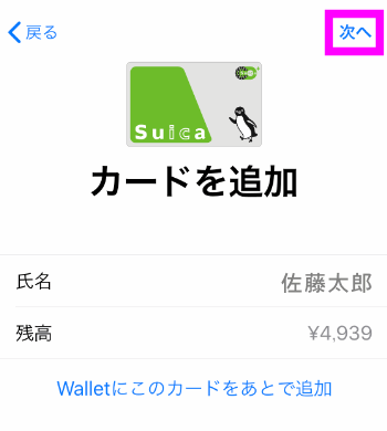 Suicaの詳細なデータが表示されるので、右上の「次へ」をタップします。