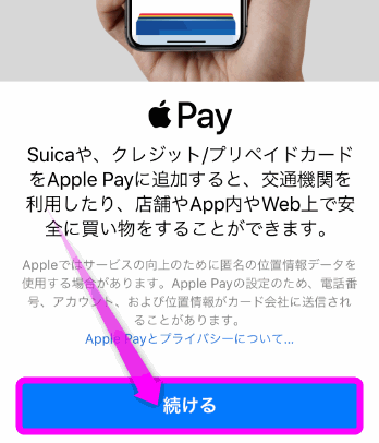 Apple Payの説明が表示されるので、「続ける」をタップします。