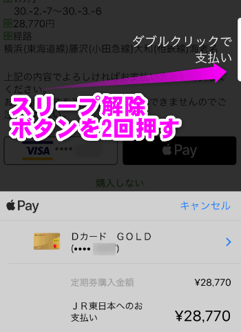 Apple Payの顔認証(もしくは指紋認証)を起動します。iPhone Xの場合は電源ボタン(スリープ解除ボタン)を2回押します。