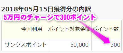 私の場合は1万年単位でViewカードからApple Payにチャージをしているのですが、4月にチャージした額は5万円でした。それが5月の15日にポイントとして反映されたのですが、300ポイントが付加されています。
