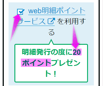 明細を発行せず、インターネット上で確認する「Web明細ポイントサービス」に登録すると、毎月20ポイント(50円相当)がたまります。
