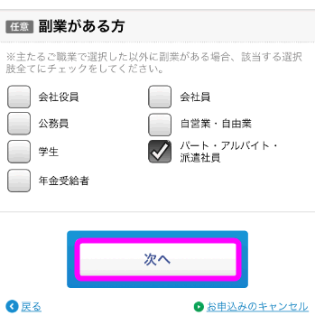 職業や副業をしている場合は、該当するものにチェックを入れます。