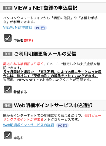 「VIEW'S NET」と「Web明細ポイントサービス」は必ず申し込んでください。ポイントが付きます。
