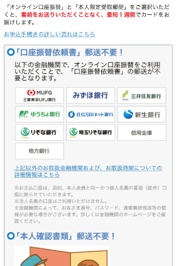 「三菱東京UFJ銀行」「みずほ銀行」「三井住友銀行」「ゆうちょ銀行」「住信SBIネット銀行」「新生銀行」「りそな銀行」「埼玉りそな銀行」その他信用金庫、地方銀行では口座振替依頼書の作成・郵送が不要です。