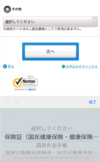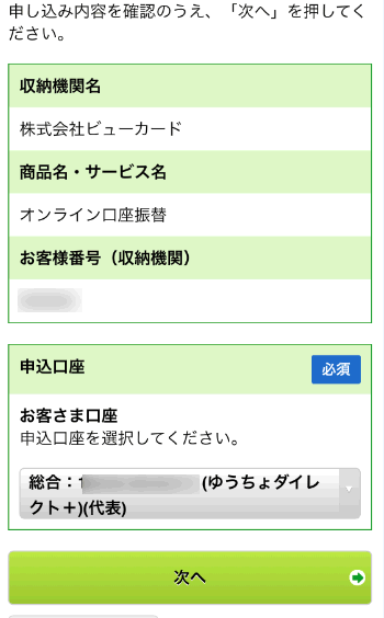 オンライン口座振替と本人限定受取郵便の申込みを選択し、次へをタップします。