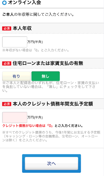 「年収」「住宅ローンもしくは家賃の支払いの有無」「クレジットカードの債務年間支払予定額」を入力します。