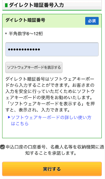 「ダイレクト暗証番号」を入力し、「実行する」をタップします。