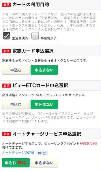 「家族カード」「ビューETCカード」「オートチャージサービス」を申し込むかを選択します。