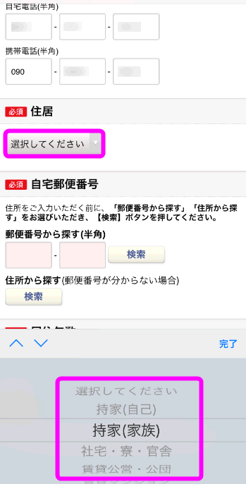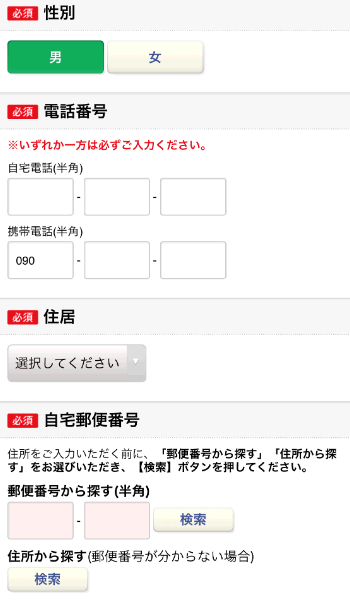 性別、電話番号、住居、郵便番号を入力します。