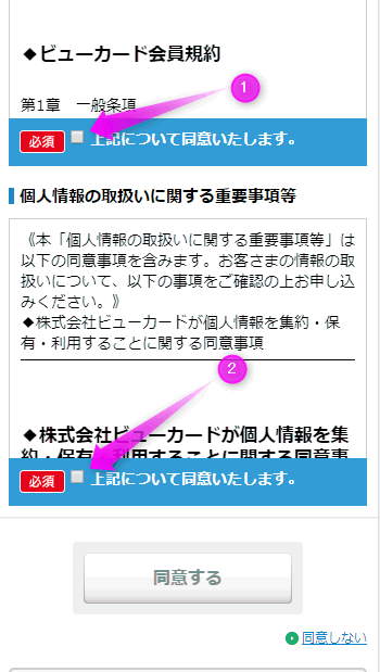 「ビューカード会員規約」と「個人情報の取扱に関する重要事項等」の2つにチェックを入れます。