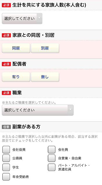 「生計を共にする家族人数(本人含む)」と家族と同居しているか、配偶者の有り無しを選択します。