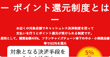 ポイント還元制度とは、電子マネー(Suicaやクレジットカードなど)を使って支払いを行うと支払金額の2%もしくは5%をポイントで還元される制度。