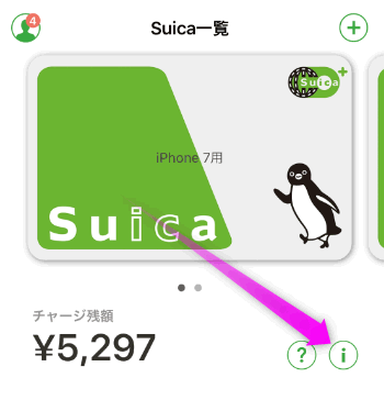 Suicaアプリを立ち上げ、登録したいSuicaの右下にある「i」のアイコンをタップします。