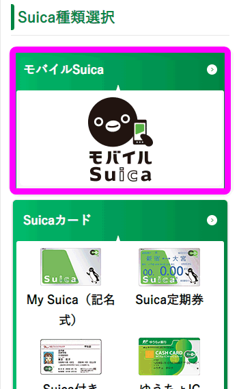 Apple PayやアンドロイドのモバイルSuicaは、「モバイルSuica」をタップします。
