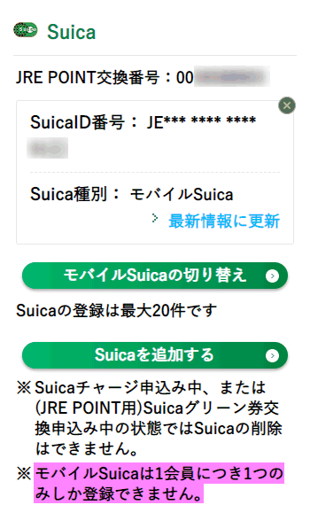 私は複数のSuicaをiPhoneに登録しているのと、Apple WatchでもSuicaを登録しているのですべてのSuicaを登録しようとしたのですが、残念ながら1会員につき1つのSuicaしか登録できないようです。。。