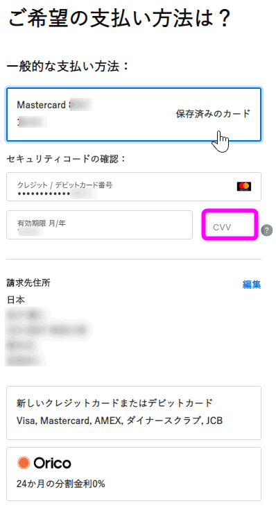 登録しておいたクレジットカードを選択し、セキュリティコードを入力します。