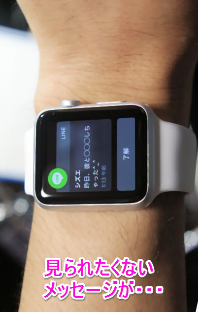 LINEやメール、メッセージなどを受信すると、Apple Watchでは「チ~~ン」という通知音がなるだけです。なので、満員電車のつり革に捕まっている時でも、見られることはありません。が、手首の角度や位置によって、自動でディスプレイが点灯したりするので、気をつけないと恥ずかしいメッセージが他人に見られる可能性も・・・。