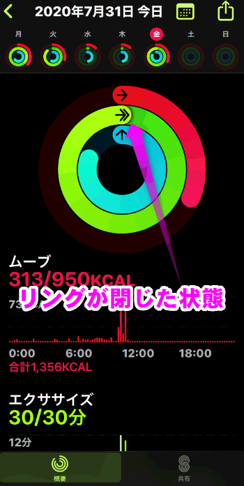 30分というのは、休憩(インターバル)を挟んでもOKです。ですが、何度か試したところ、30分ではリングが完成せず、だいたい33分ぐらいトータルで運動しないとエクササイズリングは完成しないようです。