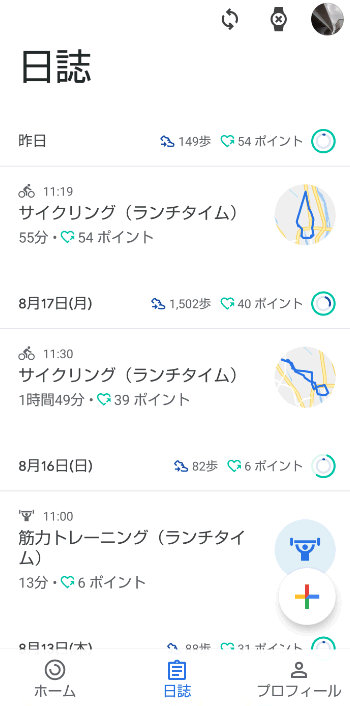 ちなみにアンドロイドにもiPhoneのアクティビティに似たアプリがあります。Fitというアプリで、こちらはカレンダー表示ではなくて、エクササイズをした日のみが表示される使用になっています。