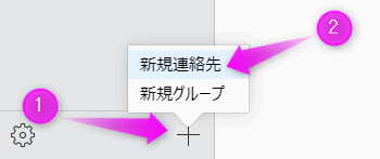 左下にある①プラスのアイコンをクリックし、②「新規連絡先」をクリックしてiPhoneの連絡先を追加しておきます。