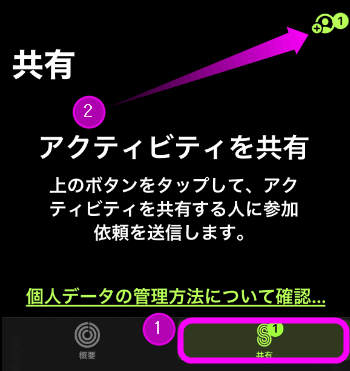 iPhoneで確認するには、「フィットネス」アプリの「共有」タブをタップすることで表示されます。