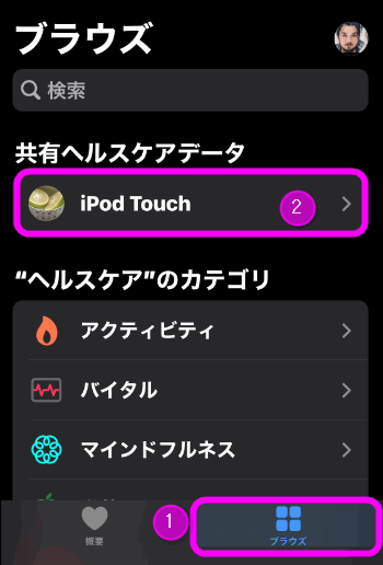 ①の「ブラウズ」をタップし、②に表示されたApple Watchの名前をタップします。