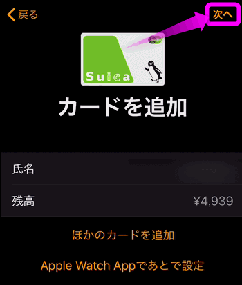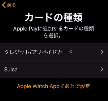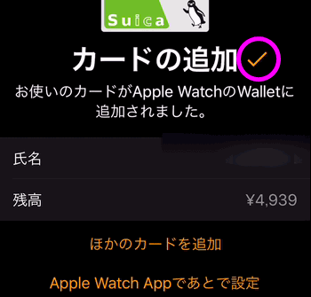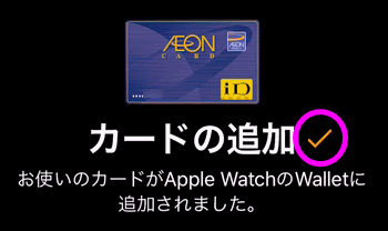 カードの追加と表示され、その右横にチェックが付けばApple Watchで使えるようになりました。