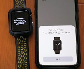 Apple Watchを起動させた状態で新しいiPhoneのそばに置くと、このようにiPhoneの画面の下の方にApple Watchと接続するか聞いてくるので