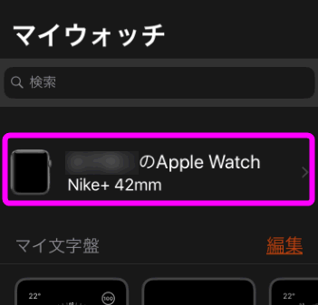マイウォッチの下に接続中のApple Watchの名前が表示されているので、ここをタップします。
