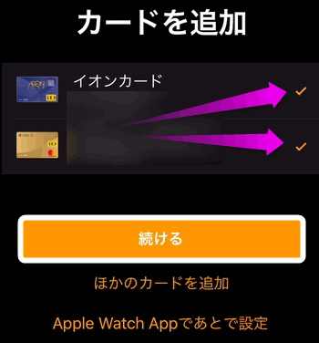 Suicaではなくクレジットカードを選択した場合は、今までApple Watchに登録していたクレジットカードやiPhoneに登録しているクレジットカードが表示されるので、「続ける」をタップします。