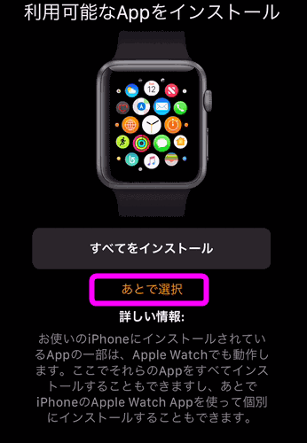 「利用可能なAppをインストール」では、今までApple Watchで使っていたアプリを今、インストールするかということなのですが、Apple Watchを2年間使ってきて感じたのが、「ワークアウト」と「リマインダー」「天気予報」「時計関連」以外はほぼ使わないし、使えないアプリが多いので、「あとで選択」をタップしました。