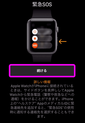 Apple WatchのApple Payの設定が終わったら、「緊急SOS」の使い方が表示されるので、「続ける」をタップします。