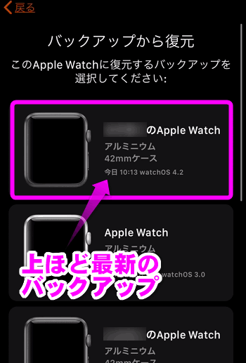 すでにApple Watchを使っていて、iPhoneを古いiPhoneのバックアップから復元させた場合、このように「バックアップから復元」が選べるようになっています。