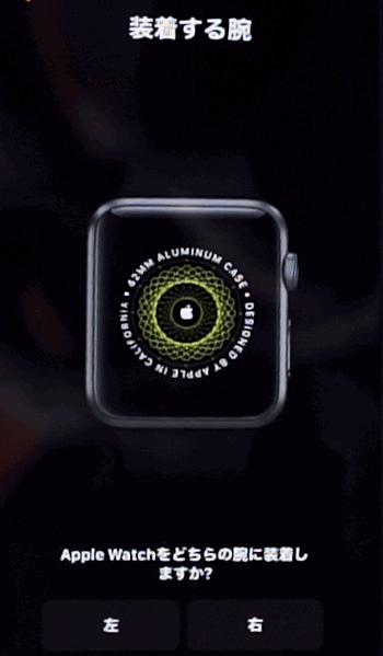 このようにバックアップ復元用のボタンが表示されず、いきなりどちらの腕でApple Watchを使うか聞いてきます。