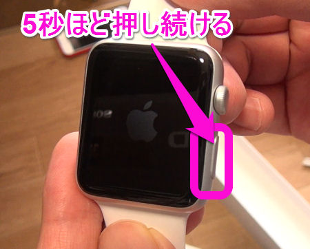 封を開けたら、Apple Watchの左側面にある長細いボタンを5秒ほど押し続けると、うっすらと画面にりんごのマークが表示されるので、このまましばらく待ちます。