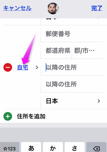 自分の電話番号を登録してある連絡先を編集し、住所のところに「自宅」を指定して住所を入力します。