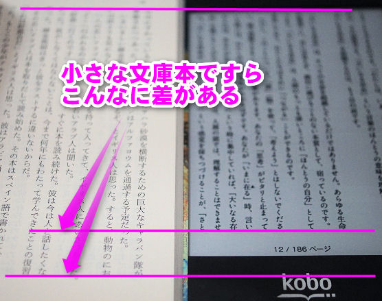 そのため、文庫本よりも大きい本を自炊し、PDF化して転送して表示させても、読むのがかなり厳しくなります。