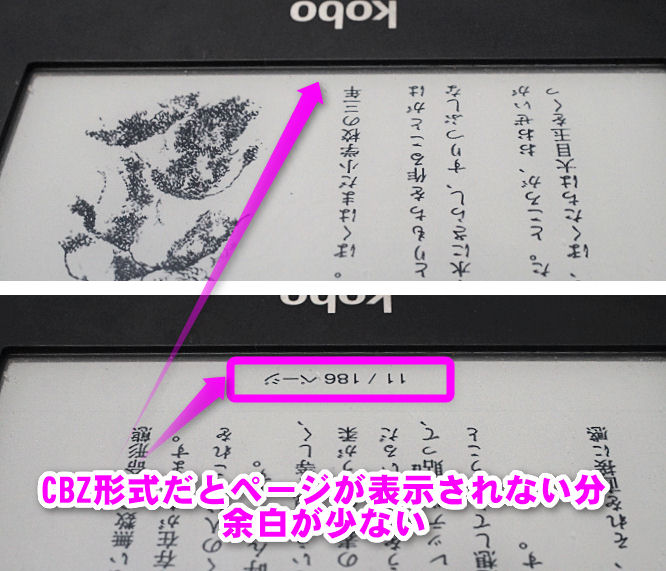 PDF形式だとページ数表示が消せないので、CBZ形式に対応しているKoboは、Kindleより自炊ユーザー向きになります。