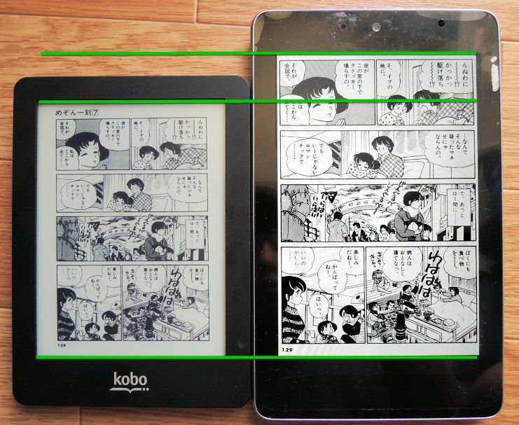 こちらの画像は、Kobo glo(左)とNexus 7(右)に同じマンガを表示させたもの。