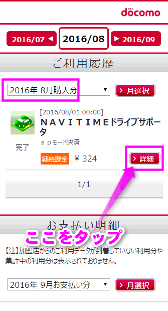 「NAVITIMEドライブサポータ(spモード決済)」と表示されています。