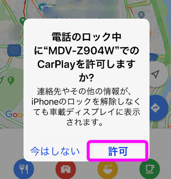 最初だけiPhoneのロック中(画面が消えた状態)でもCarPlayを使えるようにするか聞いてくるので、「許可」をタップします。