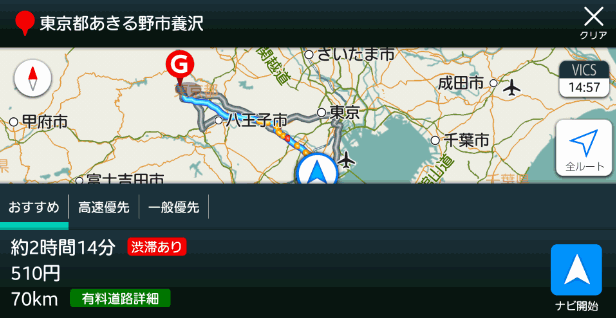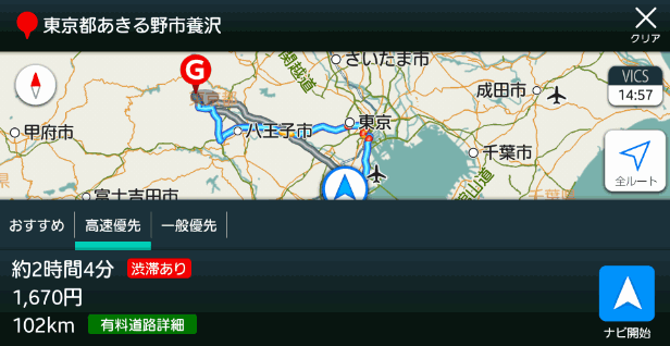 目的地へは、「おすすめ」「高速優先」「一般優先」の3つのコースから選ぶことが出来ます。