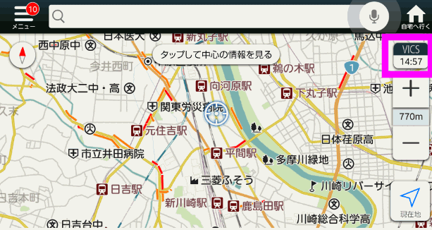 画面右上の「VICS」の下に表示されている時刻が、渋滞情報の更新時間。